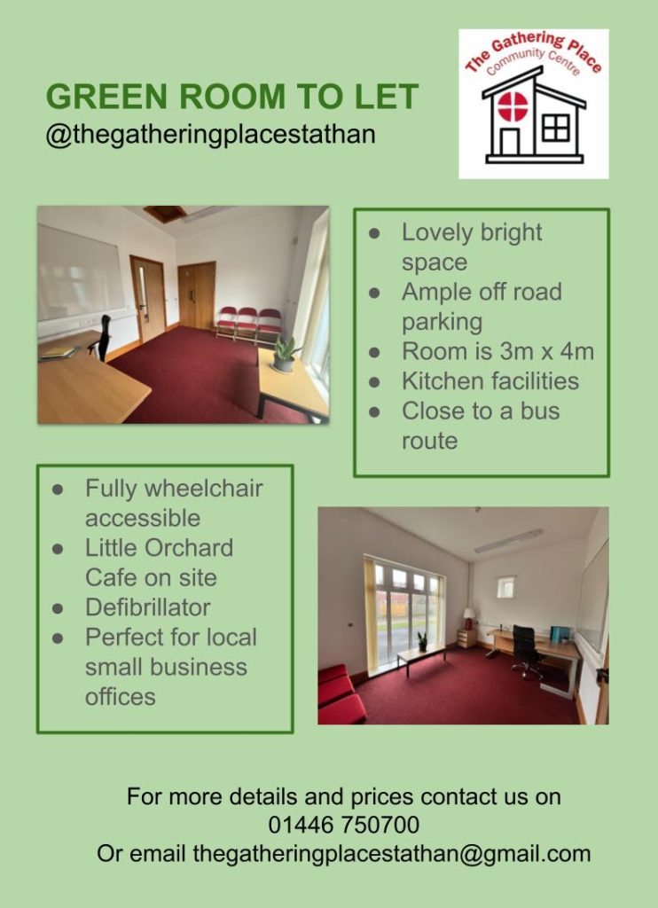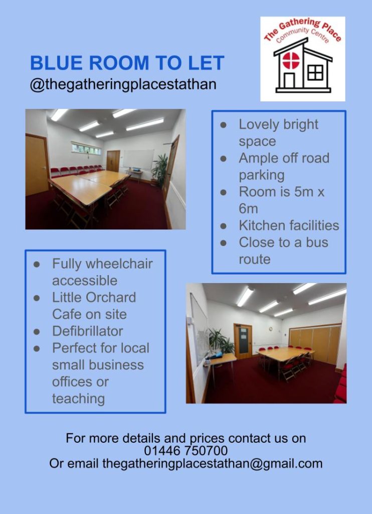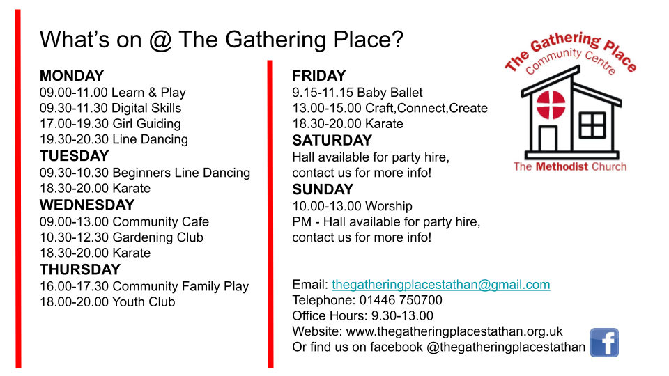 The Gathering Place in St. Athan is a great versatile building. Not only is it a Methodist Church but also a community centre that offers a huge amount of space for a variety of occasions. We have a weekly offering of activities and can hire the hall and meeting rooms out for many different purposes.